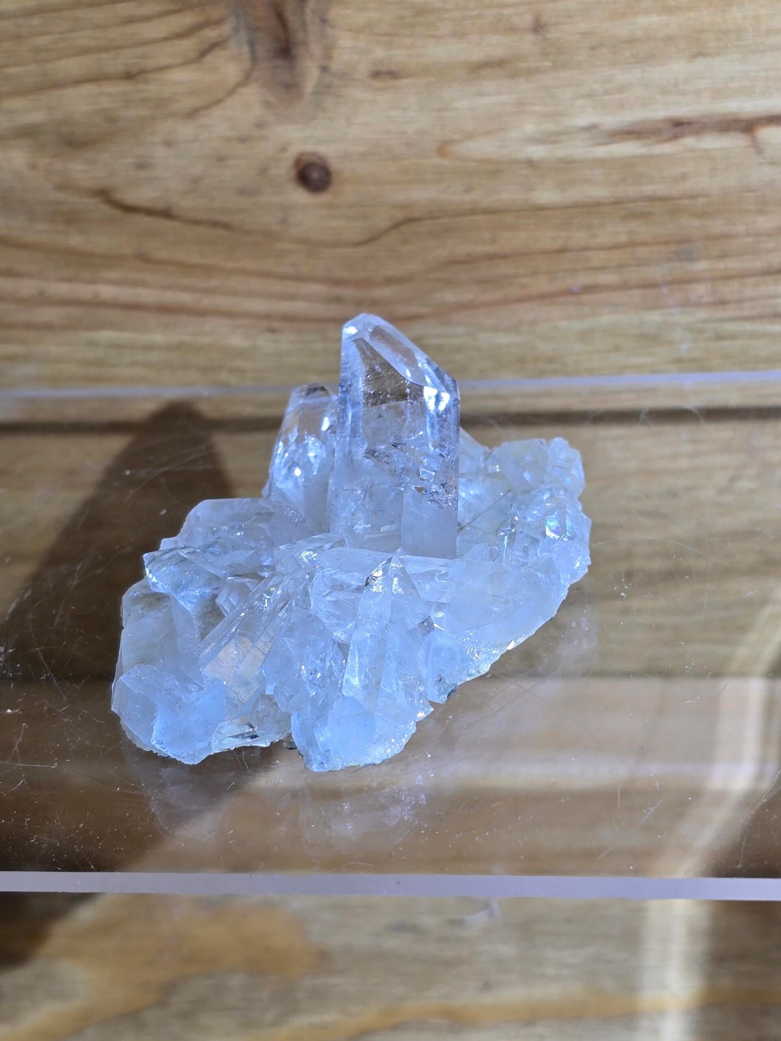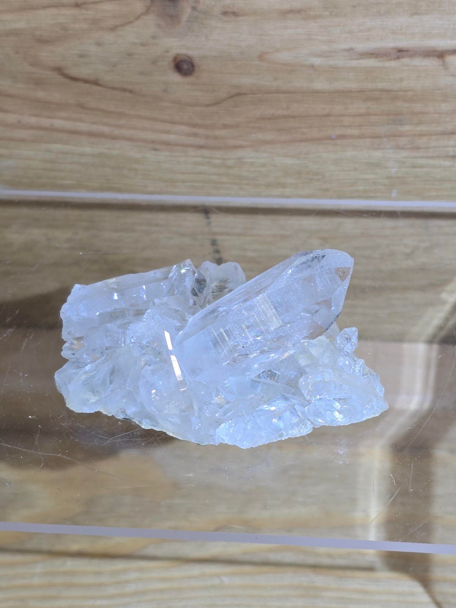 Un cluster de cuarzo cristal de Brasil , de gran claridad y alta transparencia , es un ejemplar clásico y muy apreciado dentro del coleccionismo mineralógico por su pureza, brillo y equilibrio natural .