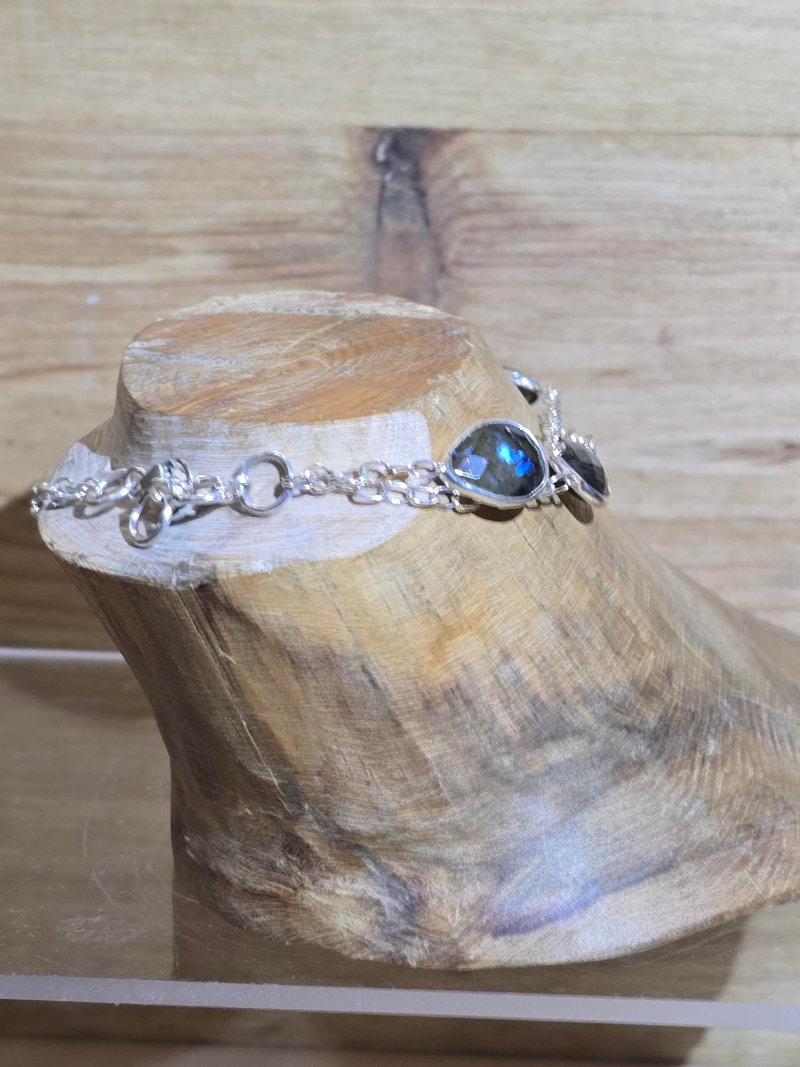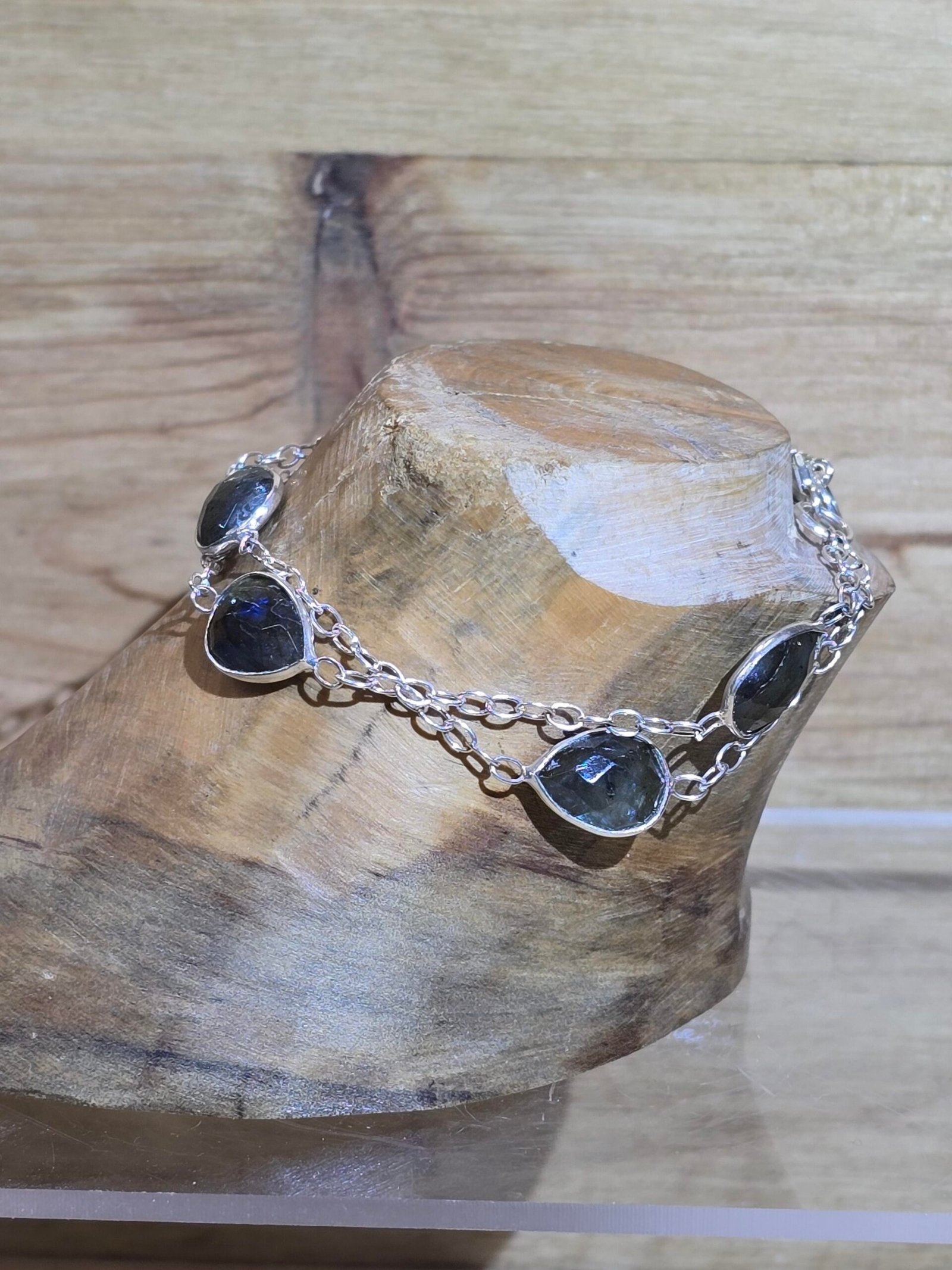 Déjate cautivar por la magia de la labradorita facetada , una piedra que revela destellos únicos en tonos azules y grises según la luz Esta pulsera doble está elaborada en plata 925 auténtica , combinando elegancia y energía en una sola pieza.
