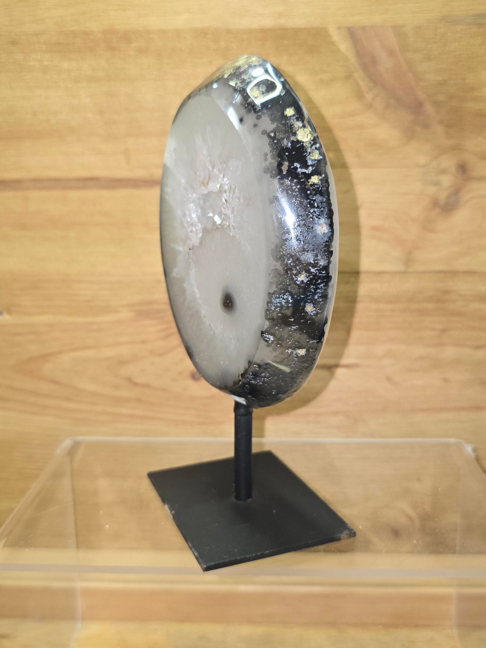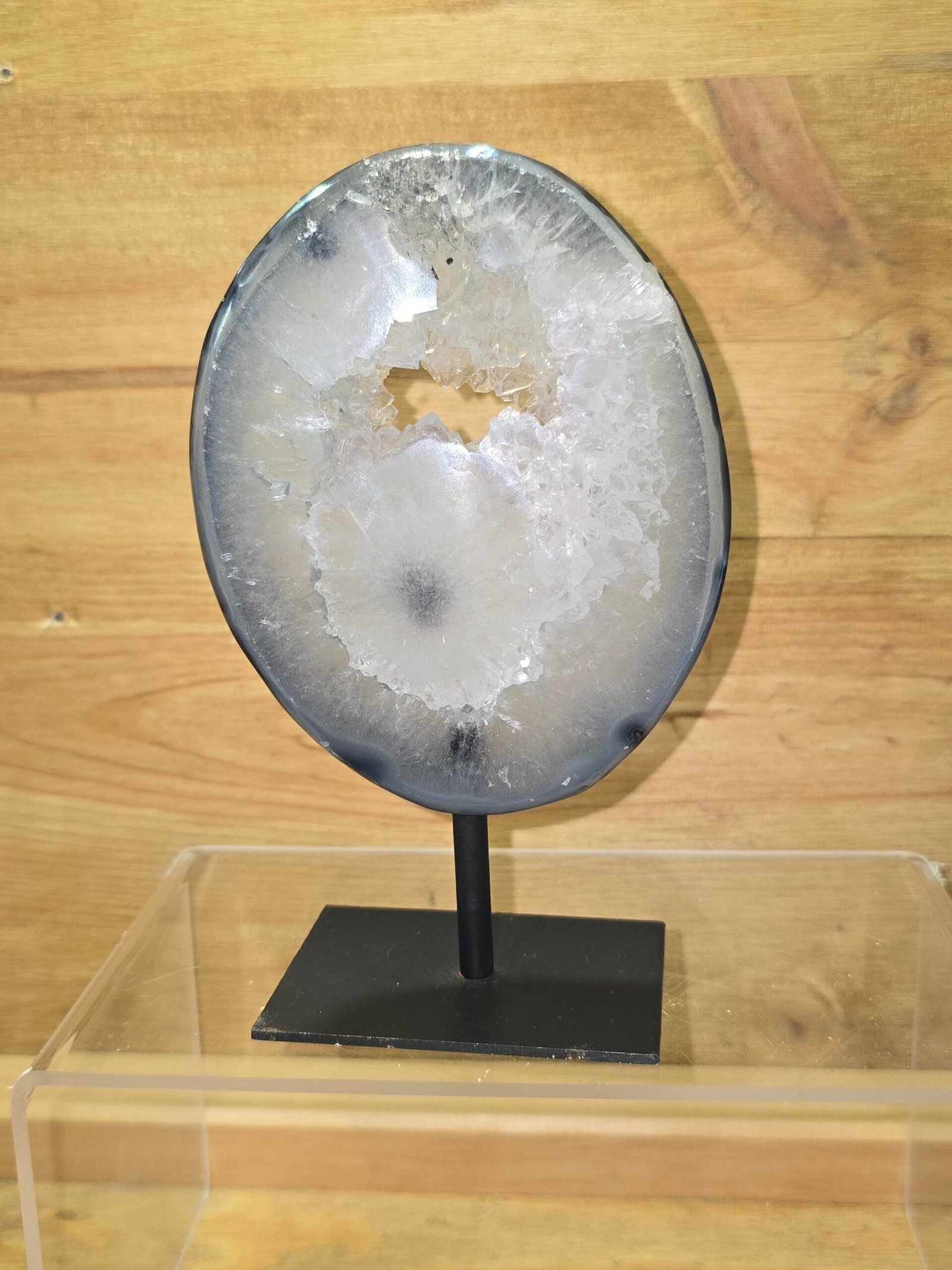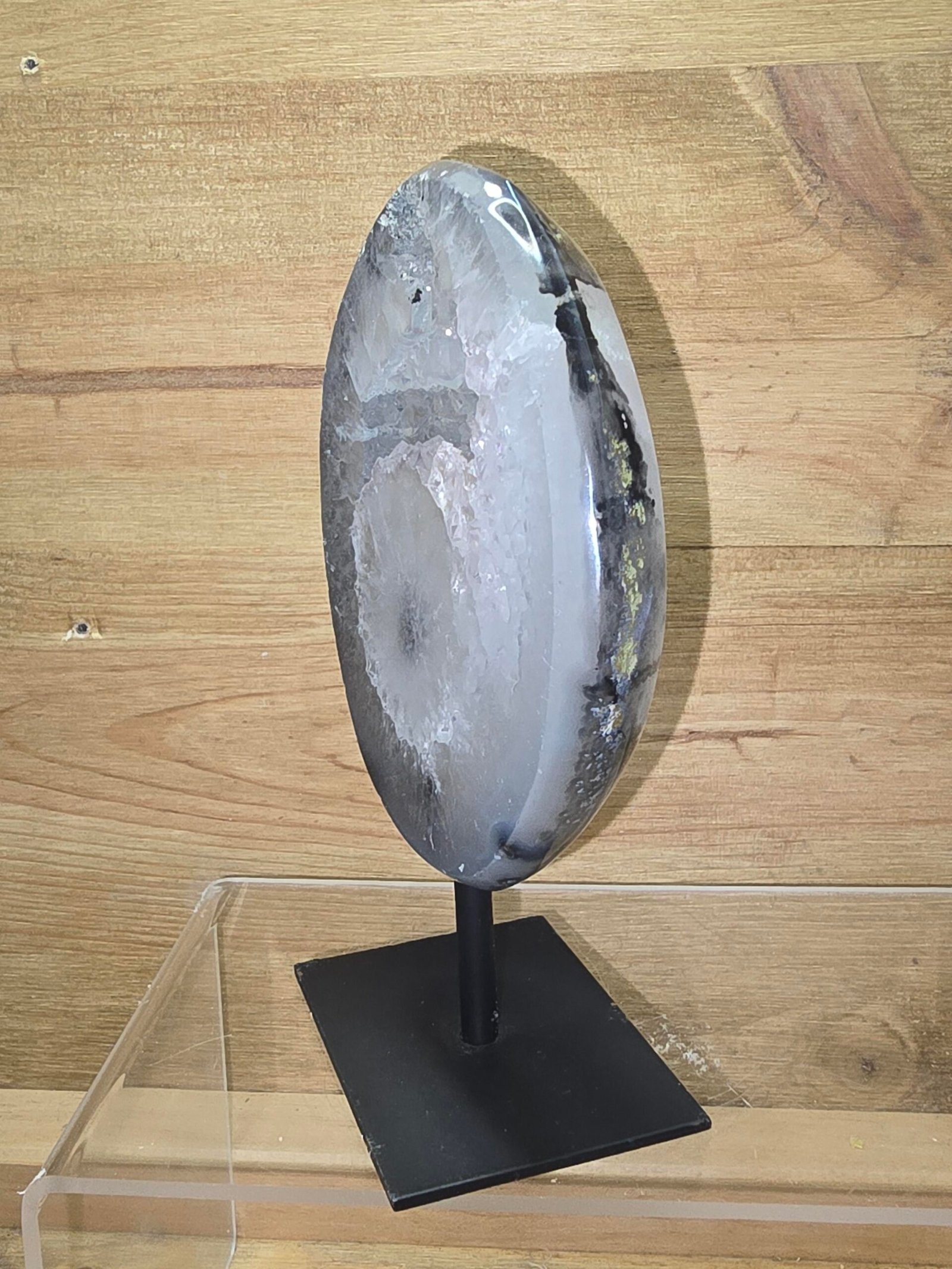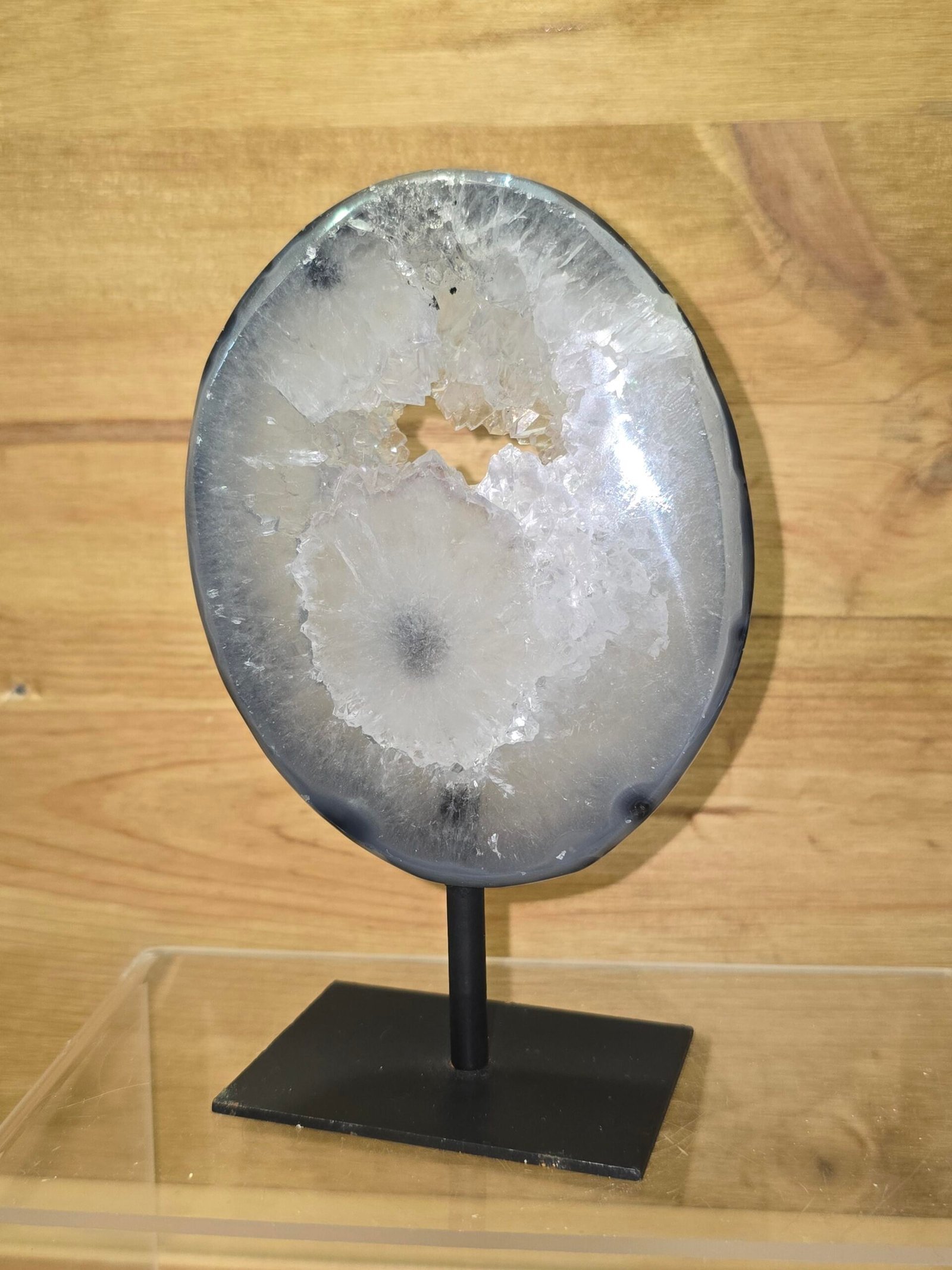 Mineral: Ágata (variedad de calcedonia) Aspecto: Transparente a ligeramente translúcido Estructura: Microcristalina, con formaciones internas naturales Estado: Mineral natural, sin tratamientos Presentación: En peana de hierro
