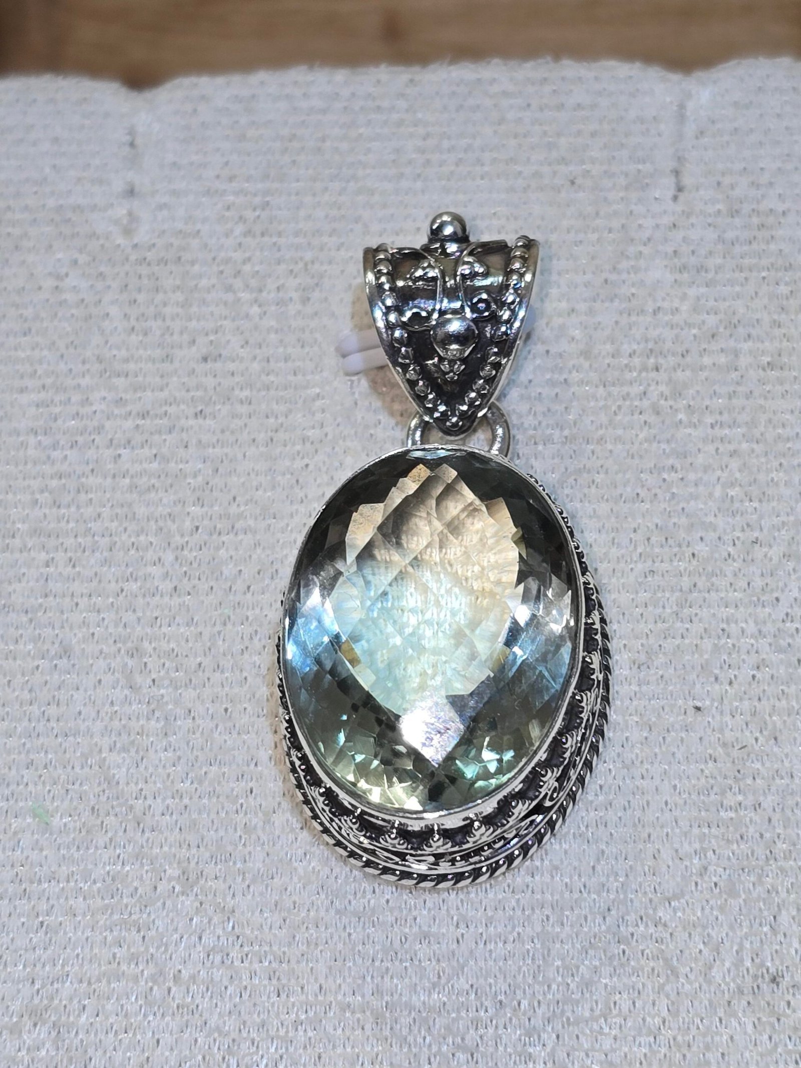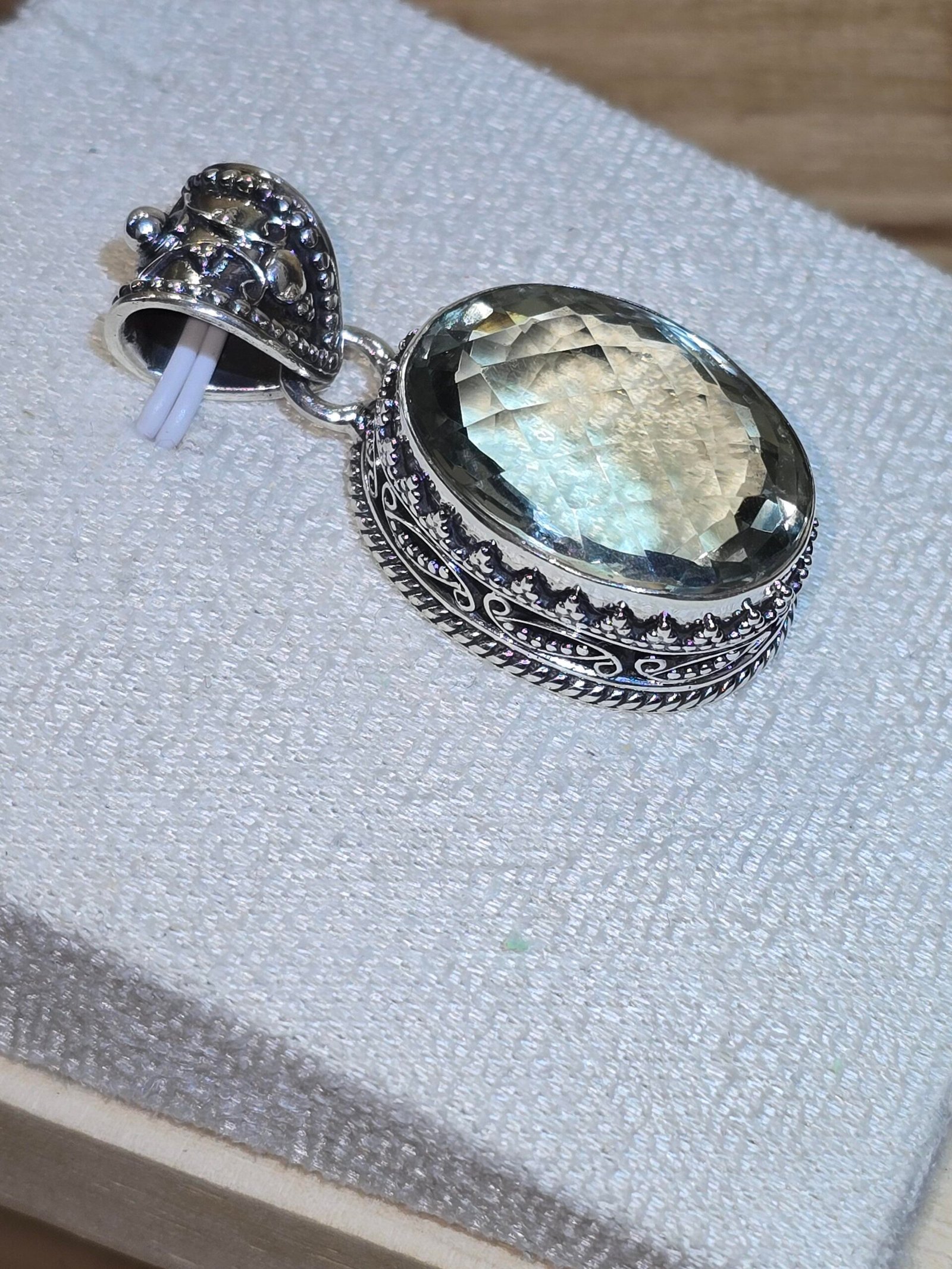 Colgante de Prasiolita doble facetado engarzado en plata 925 con filigrana artesanal