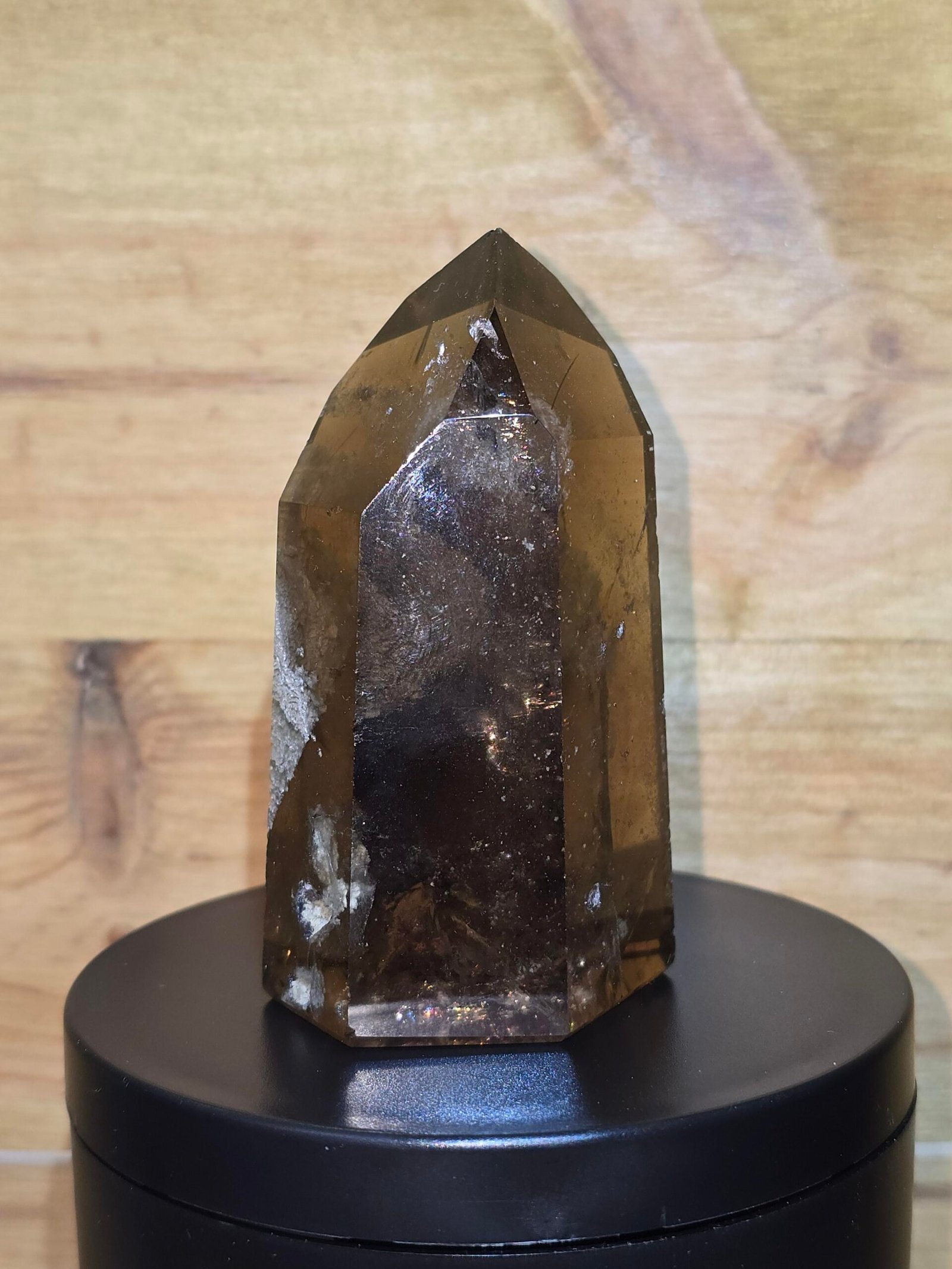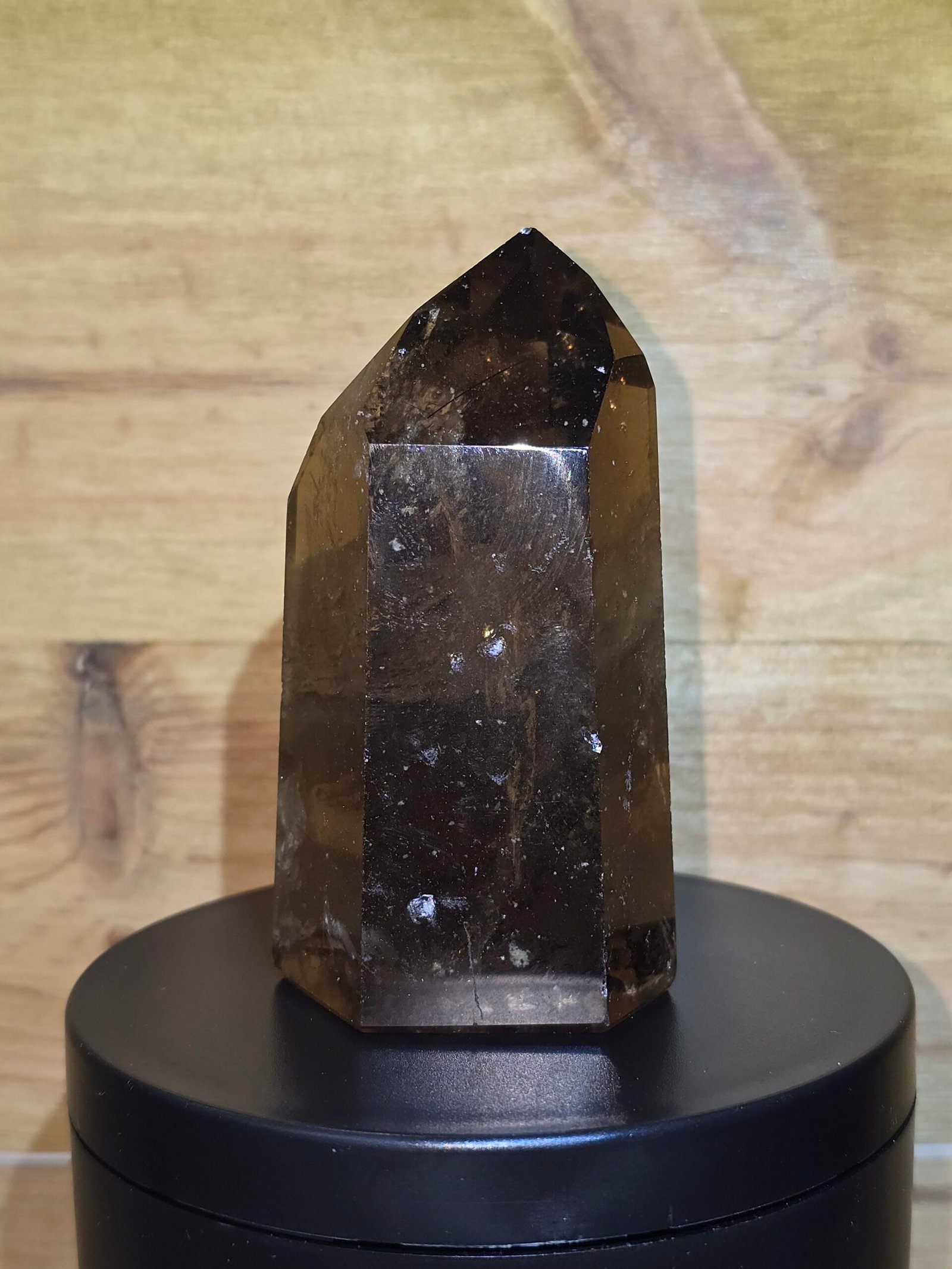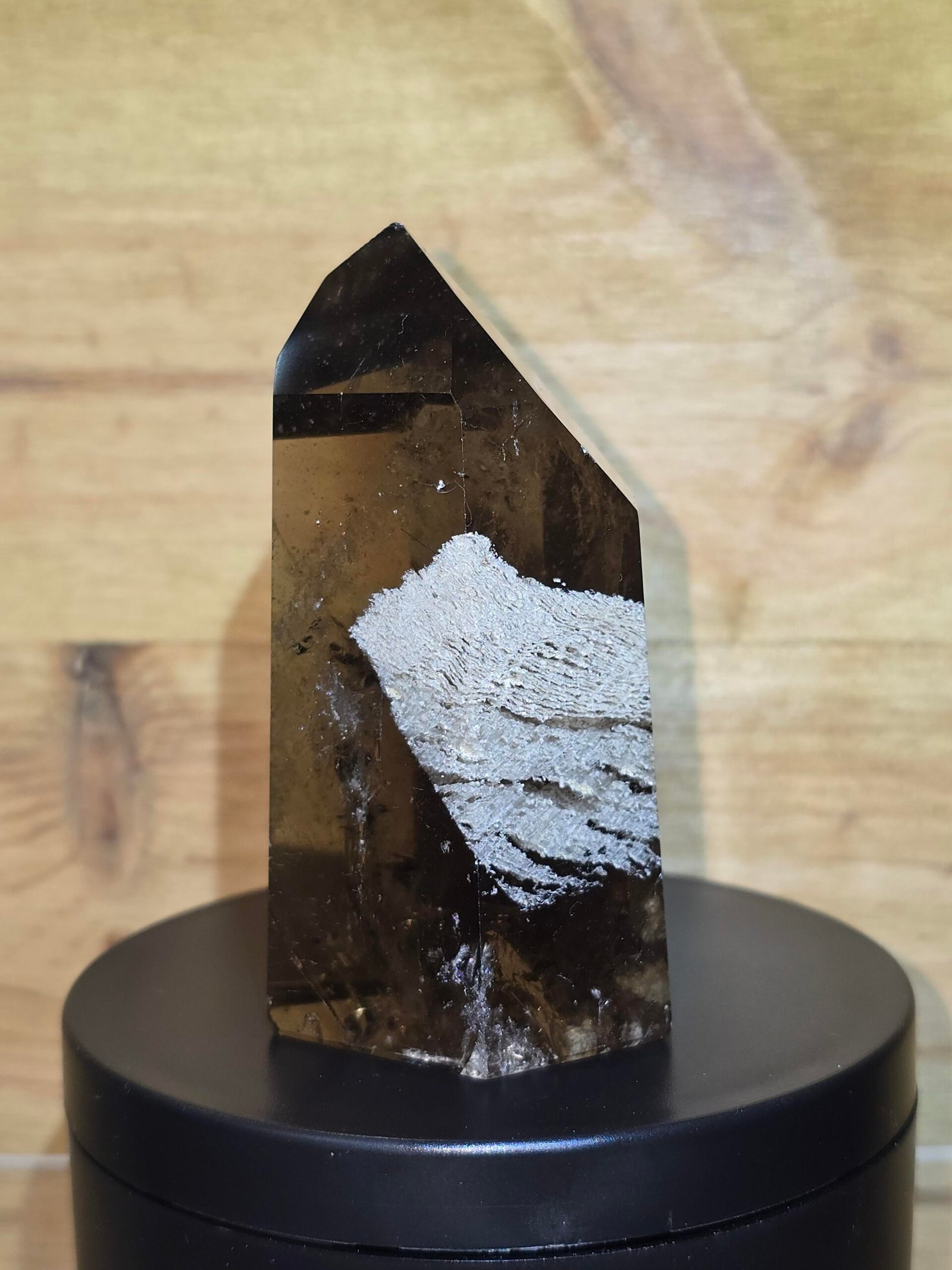 Es un cristal de cuarzo ahumado (SiO₂) que contiene inclusiones de lodolita en su interior.